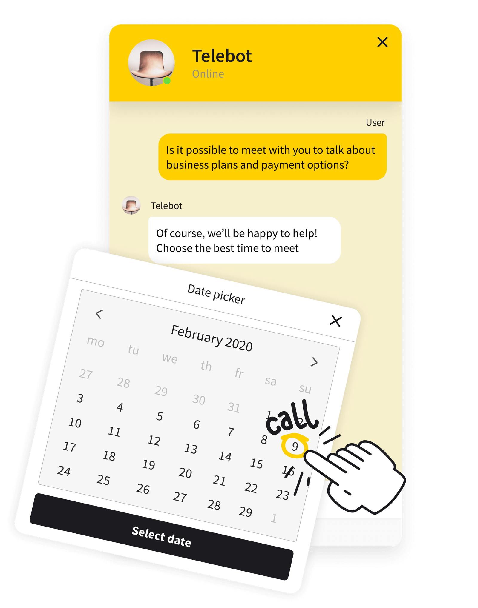 Schedule meetings with potential customers using a chatbot. Enable visitors to call you directly from the chat widget and answer their questions right away.